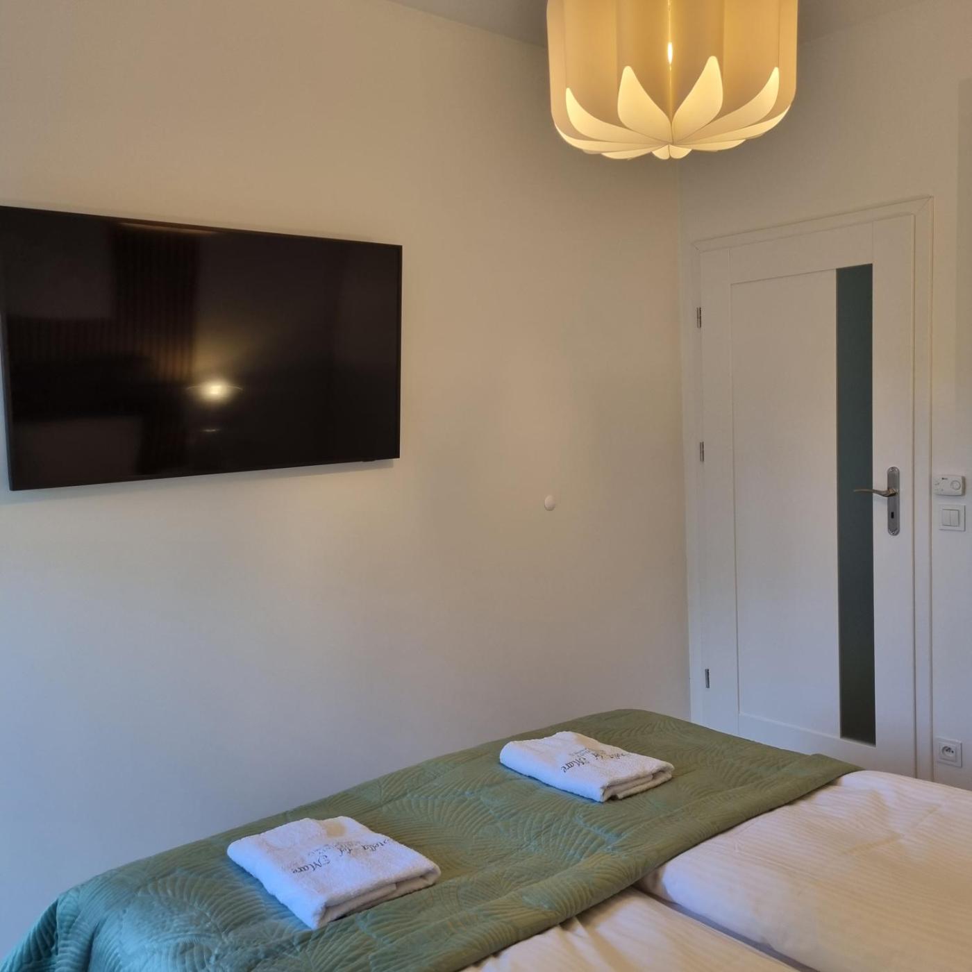 Apartament z 1 sypialnią. This air-conditioned apartment comprises 1 living room, 1 separate bedroom and 1 bathroom with a shower. Guests can make meals in the kitchen that comes with a stovetop, a refrigerator, a dishwasher and kitchenware. The apartment provides a flat-screen TV with streaming services, a washing machine, a coffee machine, a high chair for children as well as garden views. The unit offers 3 beds. Apartament - 4 osobowy. Powierzchnia pokoju ok.: 42 mkw.